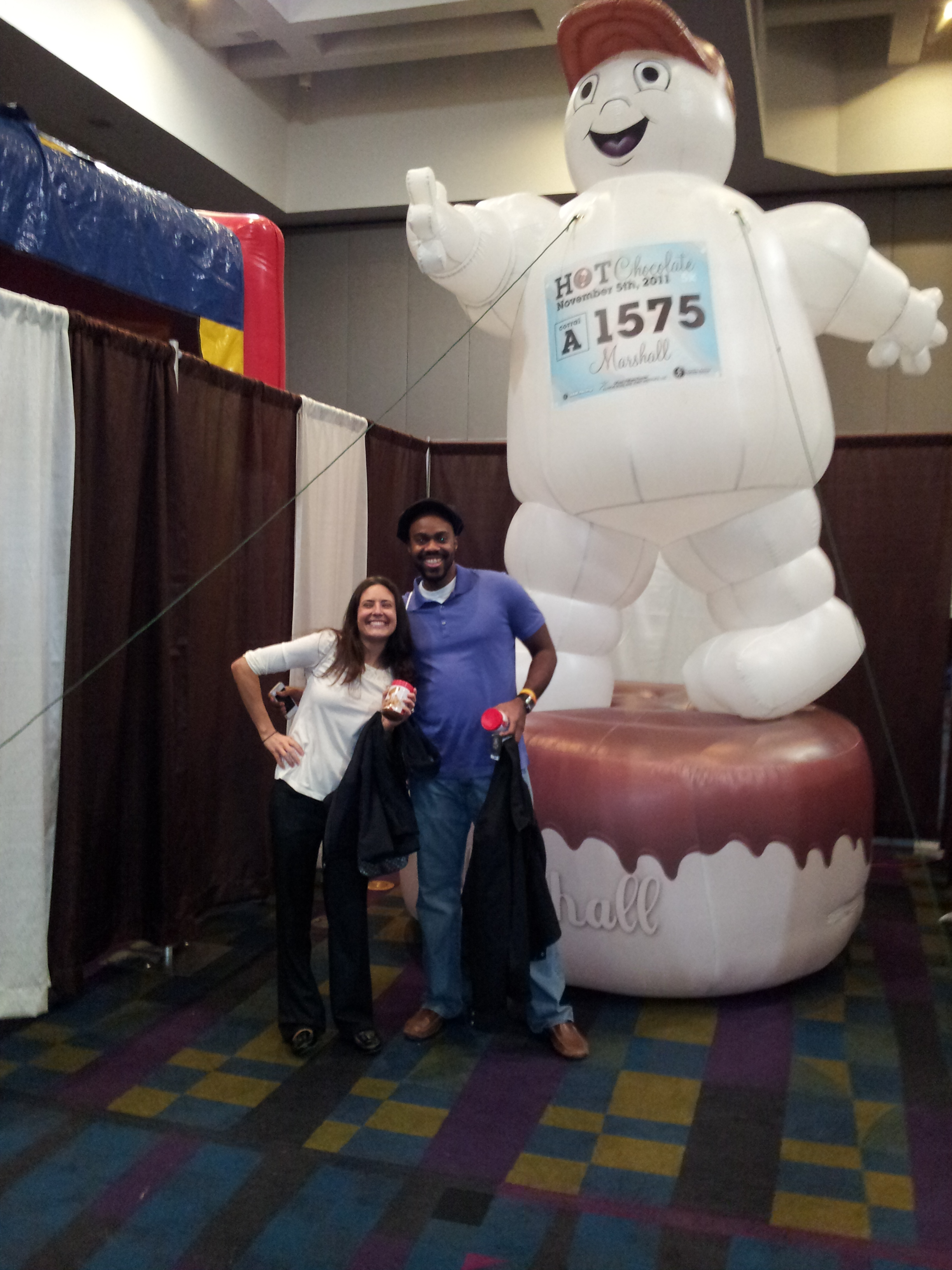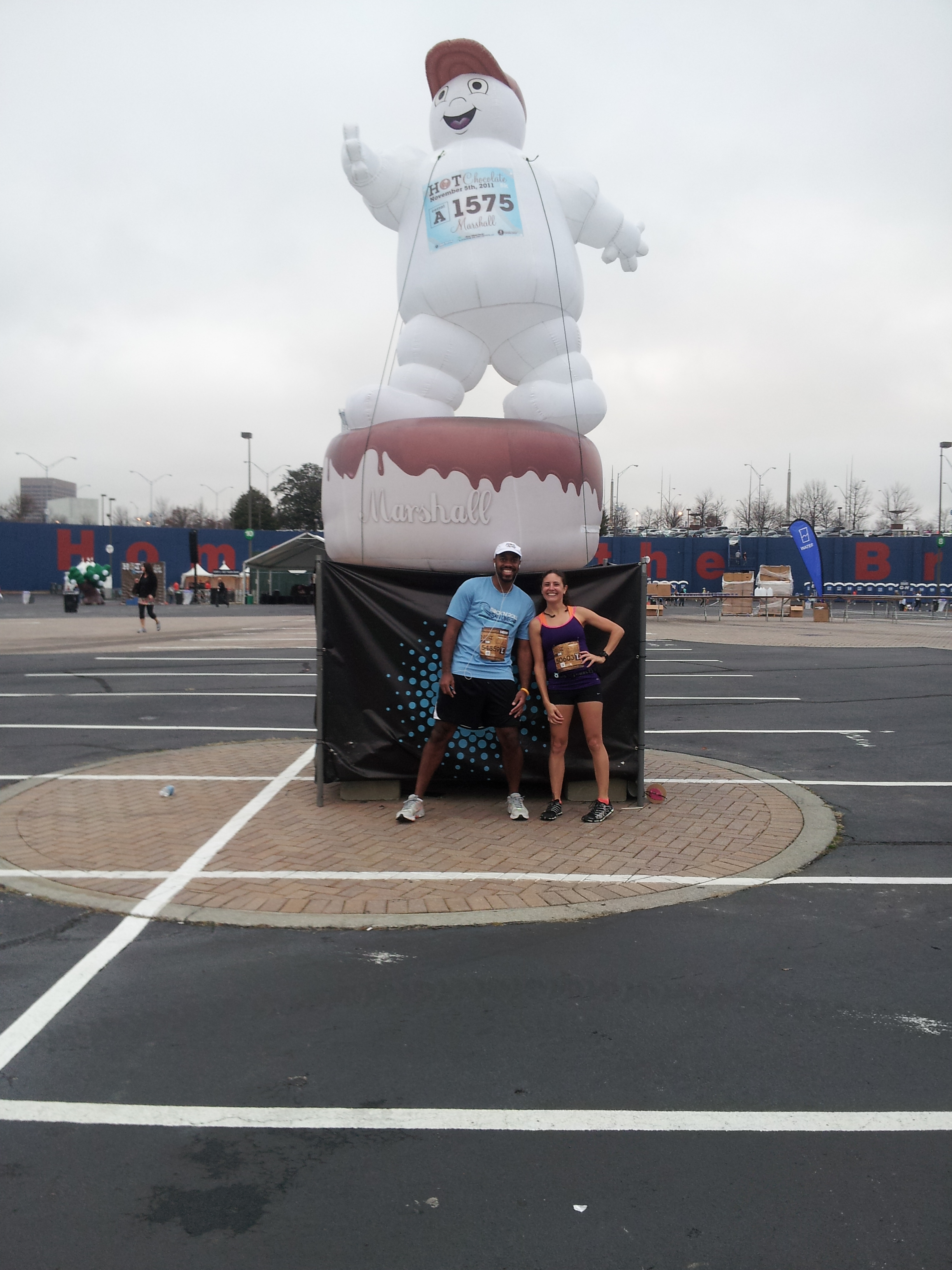 I ate the banana and waited for JS at our designated meeting place. He soon joined me with his mug and we commiserated. I was so hungry that I finally broke down and ate the marshmallow and pretzels. Probably should’ve had more than a GoGo Applesauce pre-race lol.